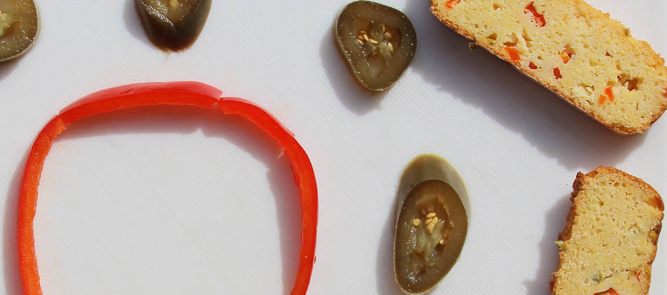 Combine cornmeal, flour, baking power & salt; stir into cheese mixture along with green onions, chilies & red pepper just until combined.