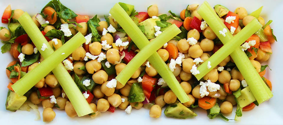 In a large bowl, combine the chickpeas, red onion, peppers, celery, spinach, kale, tomatoes, carrots, avocado and parsley.