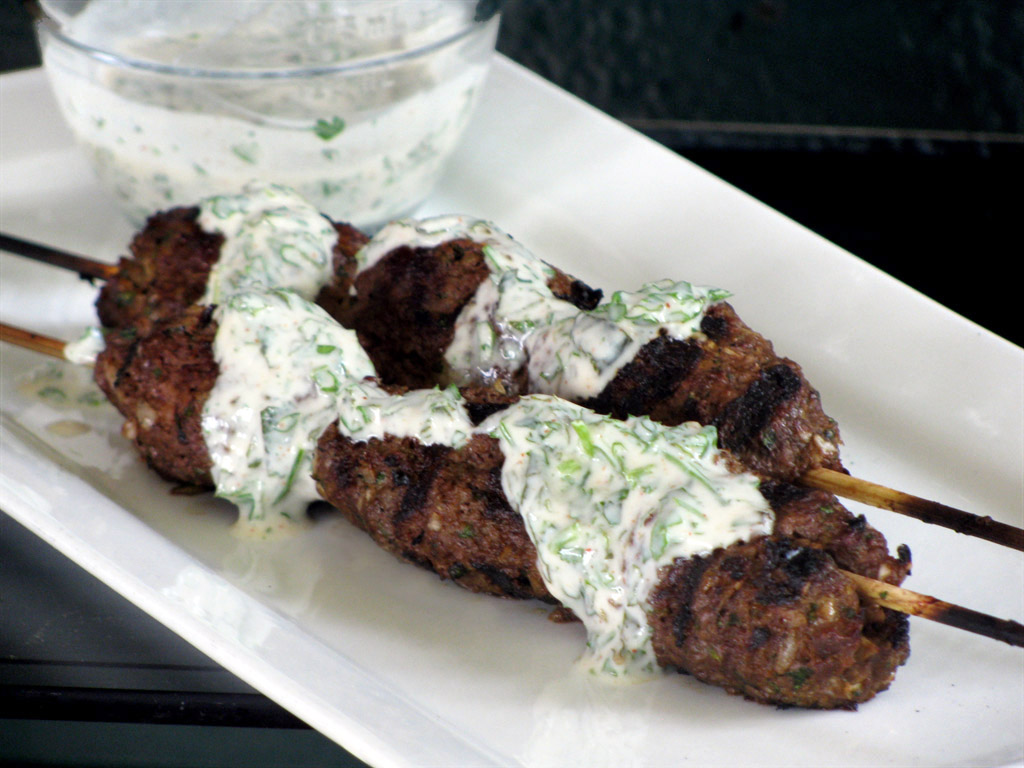 Divide the meat into 24 equal portions. Roll each portion into a ball and wrap it tightly around a skewer, squeezing it up and down, to form a sausage about 10-15 cm./4-6 inches long. Pinch it quite thin at each end.