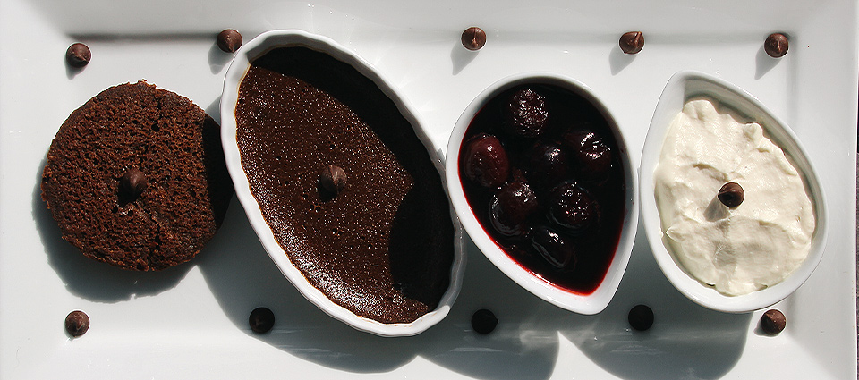 Using 3-inch-diameter round cookie cutter or a glass, dipping edges of cutter into raw cacao powder, cut 10 rounds from cold cake. Place 1 cake, 1 chocolate crème brulee, cherry compote and whipped cream on each of 10 plates and serve. Each person mindfully assembles their own black forest cake layer-by-layer and will definitely enjoy the decadence! We can't be all good, all the time!