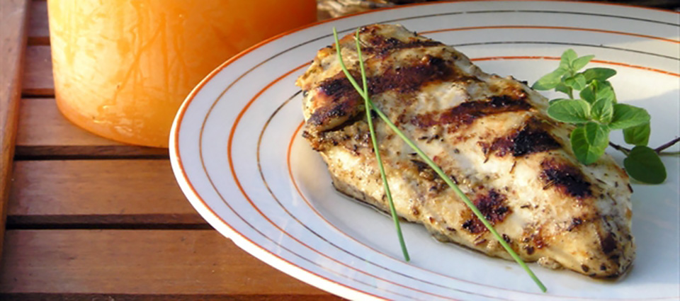 Grill chicken on the barbeque or bake in your oven (30 minutes at 350) until the chicken is completely cooked through (internal temperature 165° F / 77°C) or juices run clear when you slice the chicken.