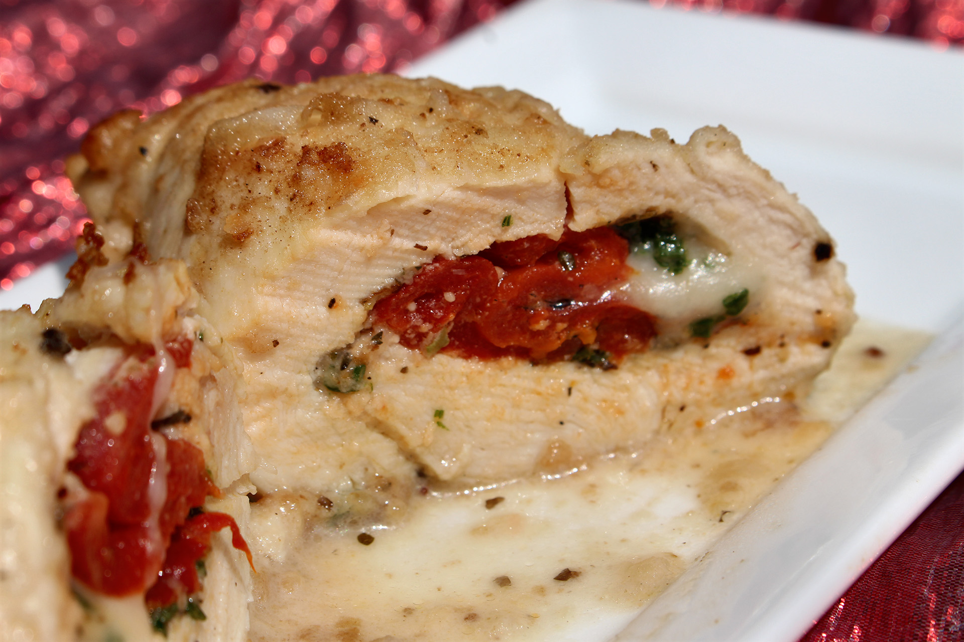 Combine Parmesan cheese with Italian seasoning, thyme and chives (or basil), and sprinkle over chicken breasts. At one end of each breast, place 3 strips of roasted pepper. Top with 1 tablespoon grated cheese. Roll each breast up (rolling away from you), starting with the side with the peppers and cheese. Insert a toothpick or two to hold together (don't forget later when you're enjoying this delectable chicken)!