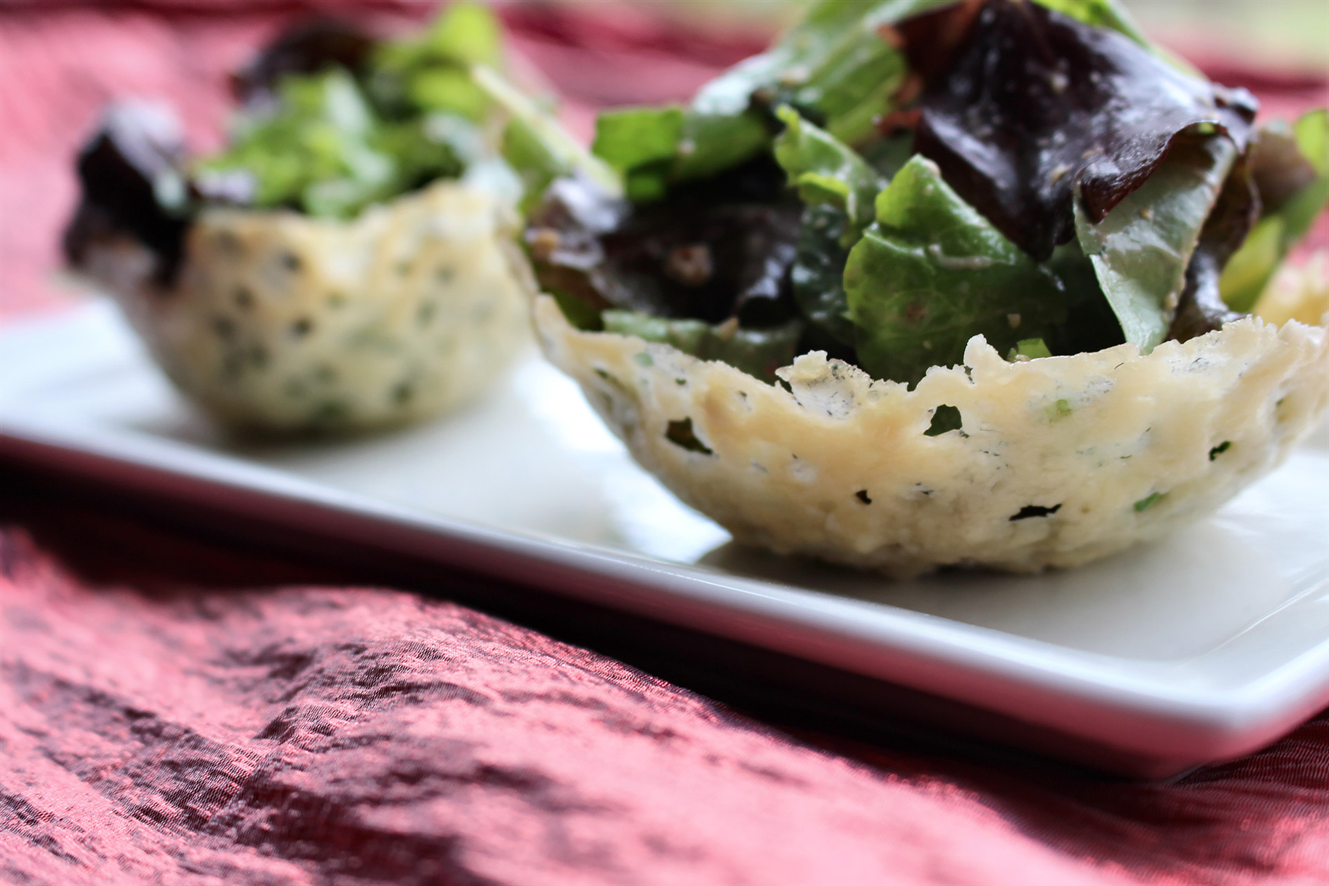 Once cheese is golden remove pan from oven, allow to sit for only a minute until cool enough to handle. Brush the bottom of a small bowl with extra virgin olive oil. Lift the Parmesan disc up with a spatula and place over the bottom of the bowl. Gently mould shape with hands. Be careful, cheese will be hot. Cool completely before removing. Handle with care. Tip: Store the baskets for up to 5 days at room temp in an airtight container.