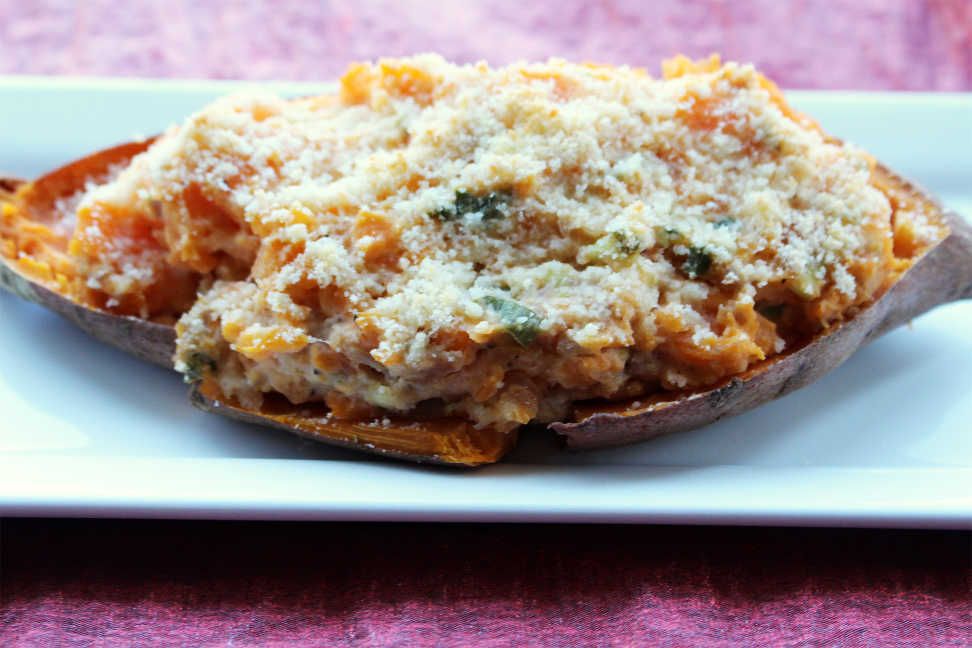 Slit potatoes lengthwise down the middle. Holding with a clean tea towel, scoop out the inside of the potato into a bowl, leaving about a ¼ inch layer inside each potato skin.