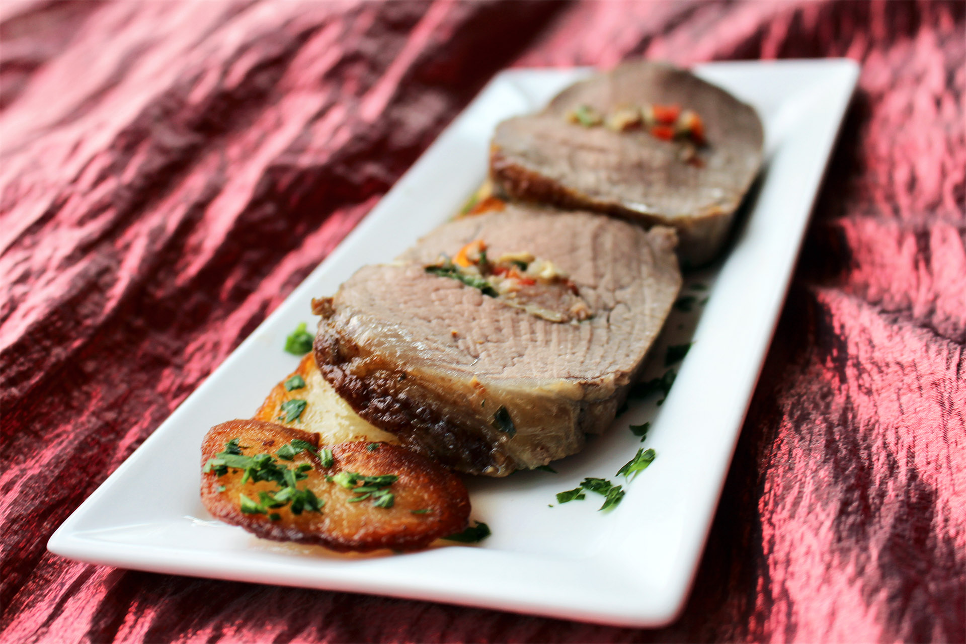 Cut tenderloin lengthwise halfway through; open like book. Place eight 12-inch (30 cm) lengths of kitchen string equally spaced under roast. Mound stuffing evenly along centre; close up and tie securely (use standard string, no need to find fancy ‘kitchen’ string). Place on rack in roasting pan.