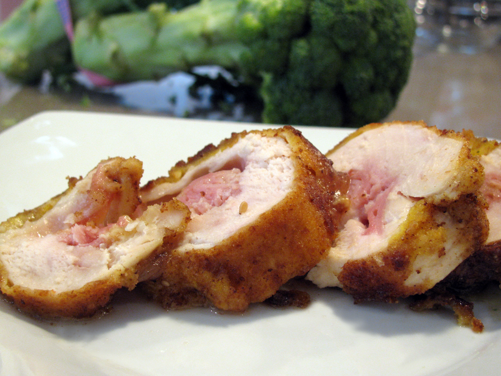 Mix flour with paprika and ½ tsp. pepper in a shallow dish. Beat eggs, add a little water and set it out in a shallow dish. Mix breadcrumbs with parmesan cheese, salt and pepper. Lay out flour mixture, egg wash and breadcrumbs in shallow dishes. Dredge rolled chicken into seasoned flour, egg wash and then breadcrumbs (assembly line-style).