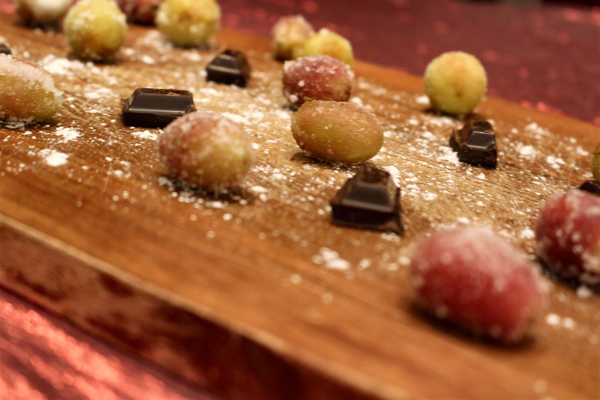 Serve grapes scattered on a wooden chopping board with pieces of chocolate and wine by the glass! How perfect is that?