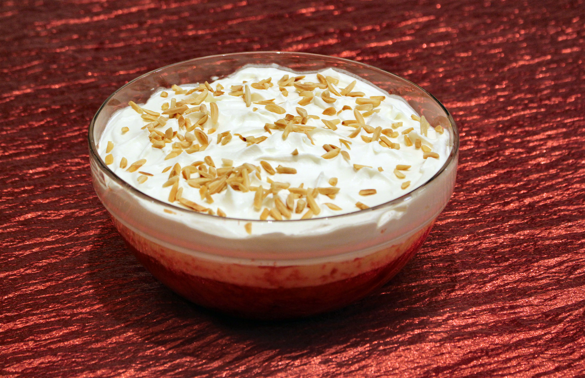 Line the bottom of a glass serving bowl with cubed cake and sprinkle the cake with the Sherry (or your favourite liqueur). Slice the strawberries (or defrost…I know it’s winter) and pour the fruit over the cake cubes, stir slightly. Make the Jello, incorporate any juice left over from the fruit. Allow the Jello to partially set and then pour over the cake and berries. Mix the custard sauce as per the instructions on the container and pour custard over the Jello/cake mixture. Place into your refrigerator to set. Mix whipped cream and pour over top of custard. Top with toasted slivered almonds (my Mom would typically decorate with coloured sprinkles).