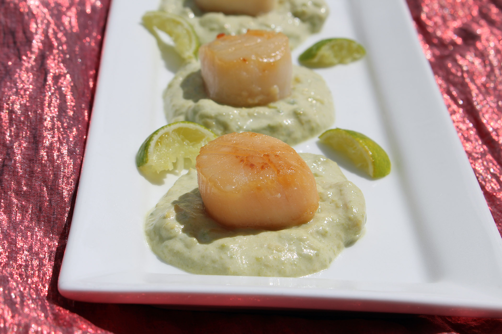 Heat a frying pan on medium heat. Add butter and garlic. Once the butter has melted add the scallops to the pan and gently sear until lightly browned, about 1 minute 1 Minute per side. Squeeze over lemon juice. Spoon some avocado cream onto each plate and place seared scallops on top. Serve with love.