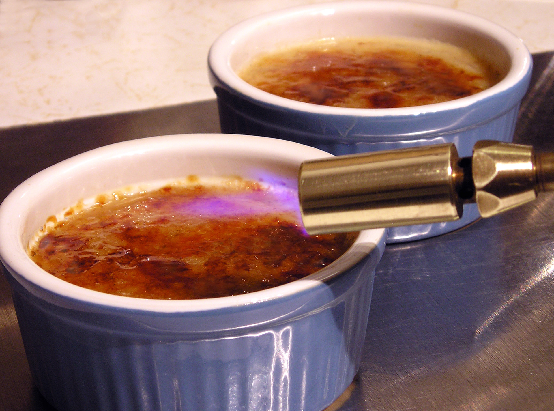 Just before serving, sprinkle sugar evenly over each custard. Place under broiler as close to heat as possible and watch sugar caramelize or use a blow-torch to heat the sugar (my husband likes the blow-torch option). It takes about 2-3 minutes and sugar will turn a golden brown colour. Sugar burns quickly, so keep a close watch as you caramelize!